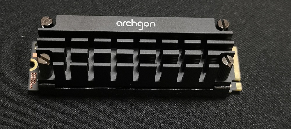 以前使っていたSSDで、Archgon HS-1110-Kというファンなしタイプのヒートシンクを使っていたのでマザボ純正と交換してみましたが、効果はほとんど出ず・・・