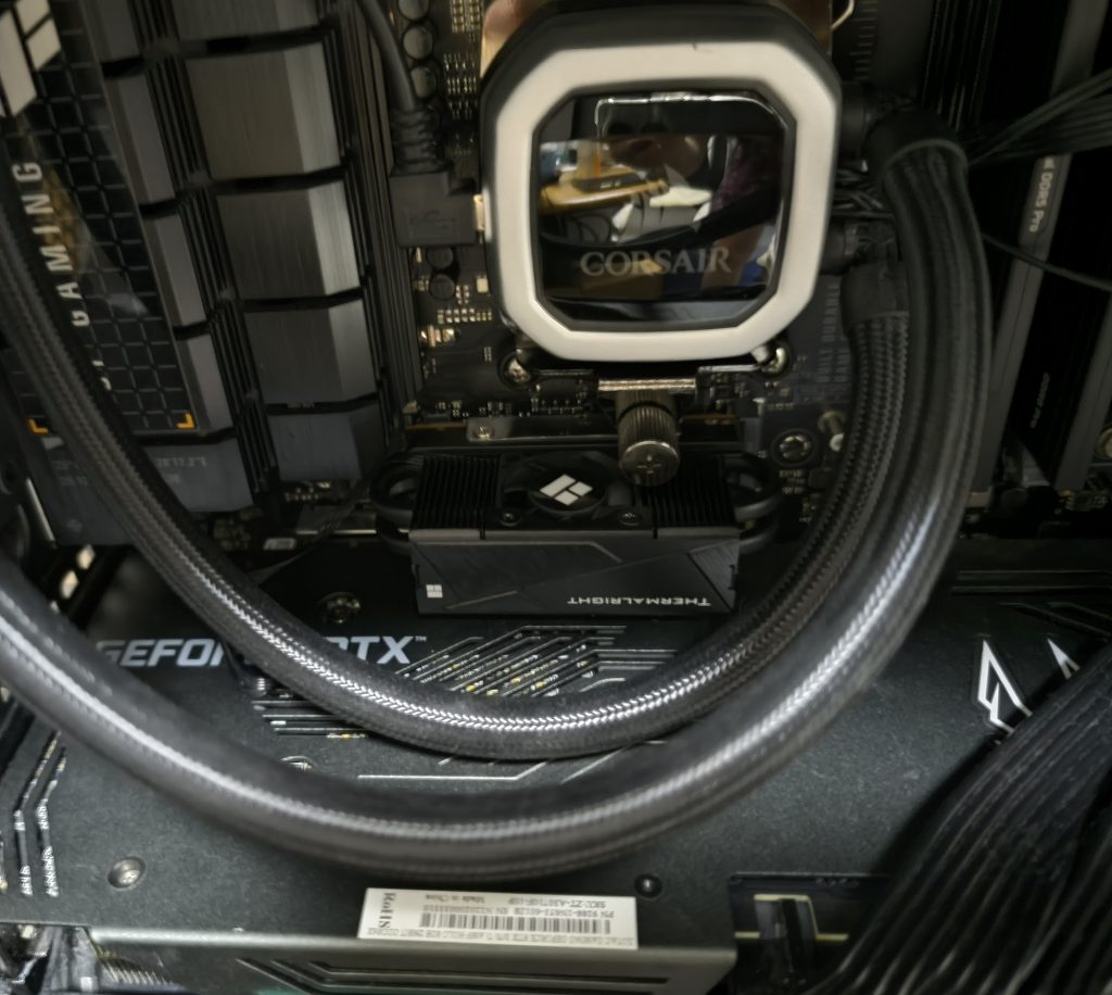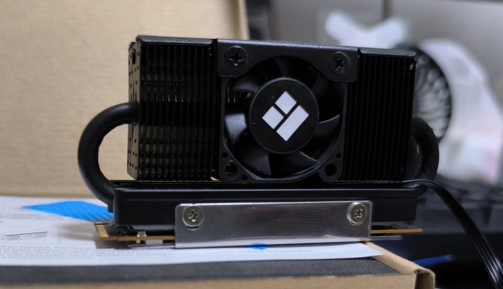 ファンなしヒートシンクでダメだったのでいっそバカでかいファン付きを購入しようか迷いましたが、PCIe5.0のスロットは1つのみでCPUクーラーすぐ下ということで小さめサイズしか収まりません。