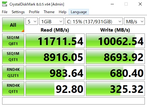 GEN5 M.2 NVMe SSDで読込速度 11700 MB/s 書込速度 9500 MB/sという普段体感できるのか分からない性能です(笑)